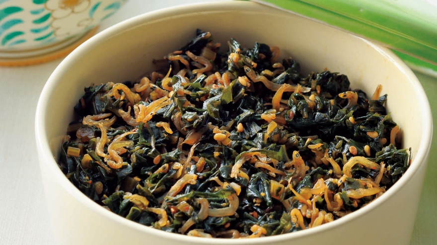 ふきの葉は、茎の部分より苦みが強いので、しょうゆをきかせてご飯のお供にします。酢を加えることで、まろやかになります。