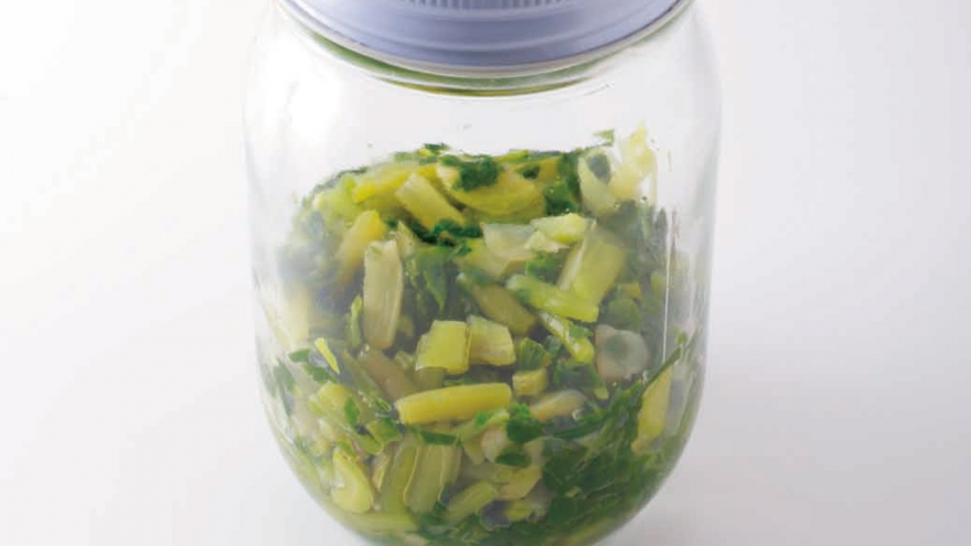 3の葉わさびを密閉瓶に入れて塩をふり入れ、すぐにふたをする。塩が溶けるまで瓶をよく振り、葉わさびの辛みを引き出す。ふたをしたまま約3時間おく。