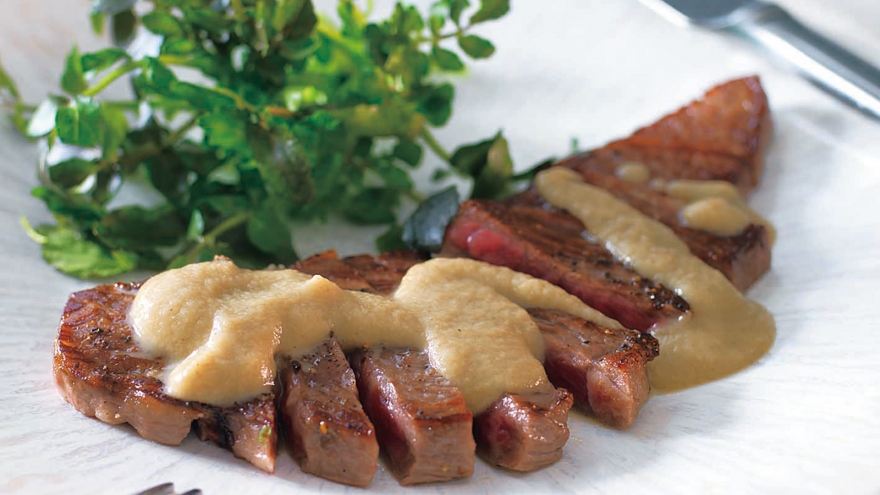 ふんわりとした食べるソースをステーキにプラスします。気持ちが上がる一皿です。
