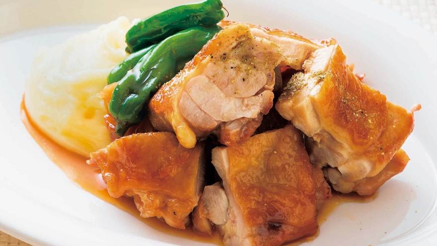 蒸し焼きした鶏肉に「黄金だれ」をかけて煮詰めるだけ。残ったたれをからめて食べる、付け合わせのマッシュポテトもおいしい!