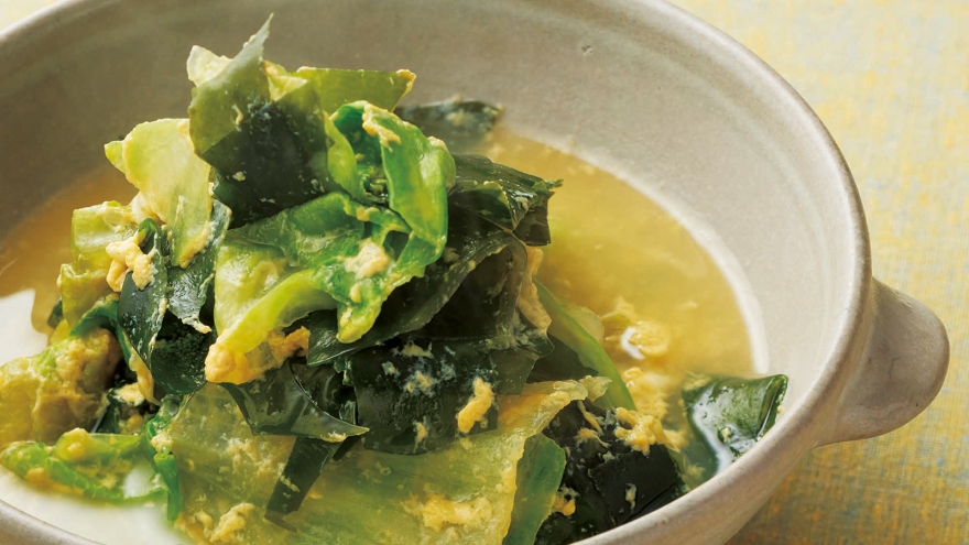 鍋に水カップ1+1/2、顆粒チキンスープの素を入れて中火にかけ、沸いたら1のレタス、わかめを加えてサッと煮る。溶き卵を回し入れ、軽く火を通す。