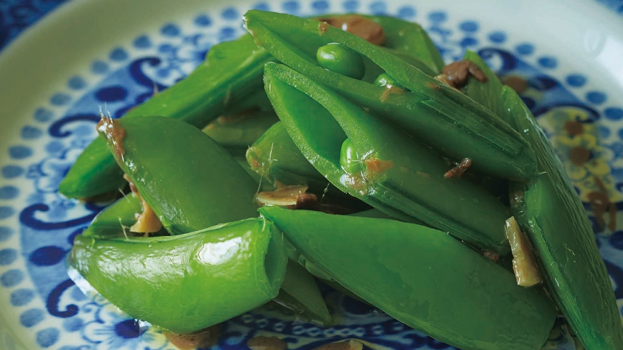 スナップえんどうはヘタと筋を取り、沸騰した湯で2~3分間ゆで、ざるに上げる。