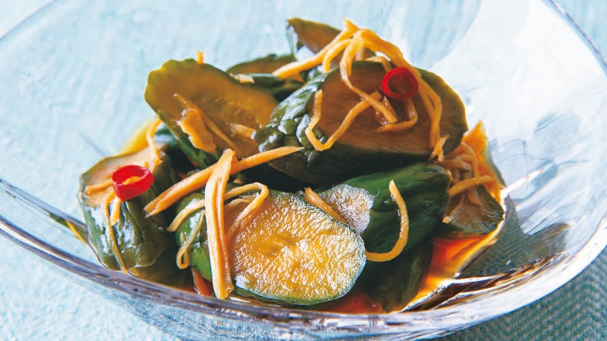 煮立てたつけ汁をきゅうりとしょうがに何度も回しかけ、シャキシャキの食感を残して、しっかりしみ込ませます。