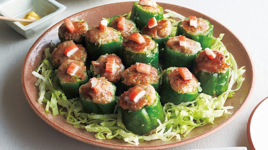 フレッシュなピーマンをシューマイの皮として、肉ダネを詰めます。ピーマンの切り落とした部分も肉ダネと酢じょうゆに加えて、余さず丸ごと使いきります。