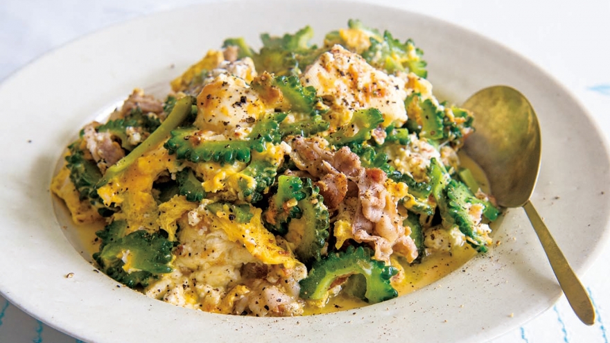 この料理は、塩加減が大事。しっかり塩をきかせたほうが、ゴーヤーの苦みによく合う。炒めながら、素材を1つ加えるたびに少しずつ塩をふり、最後にちょうどいい塩加減になるように調整する。分量の目安は、全部で小さじ2くらい。