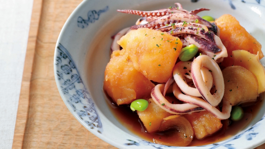 ありそうでなかった組み合わせ。じゃがいもといかは時間差で煮て、ほっこり、ふっくらと仕上げます。枝豆を散らせば、彩りもきれい。