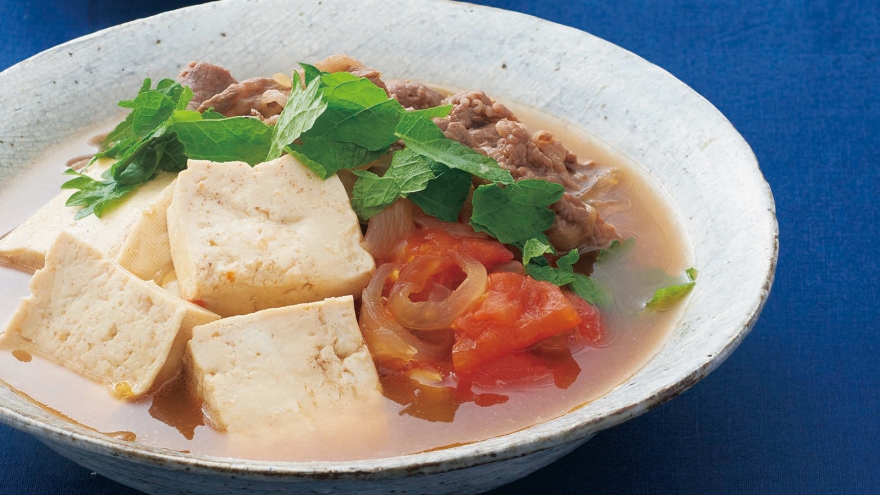 肉のうまみを豆腐に移し、トマトでさっぱりと仕上げてたっぷりの煮汁とともにいただきます。多めにつくって、翌日冷やして食べるのもおすすめ。