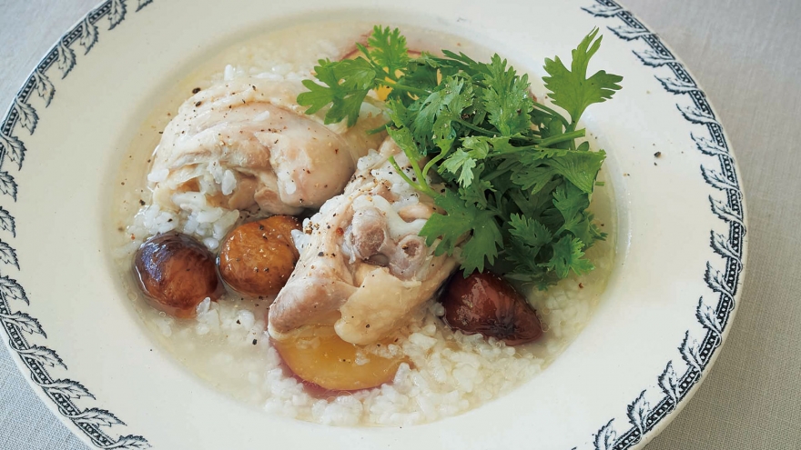 もち米やくりを鶏1ワに詰めて煮込むサムゲタンを、リゾットにアレンジ。もち米が鶏肉の濃厚なうまみをしっかり吸って、ふっくらと炊き上がります。