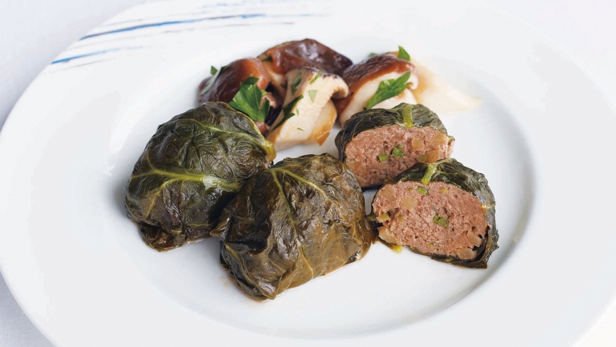 三重県と和歌山県をまたぐ熊野地方の郷土料理・目はりずしをヒントに、高菜漬けの葉でひき肉ダネを包みました。たくあんを混ぜ込み、歯ごたえと程よい塩けをプラス。きのこをソテーして添えます。