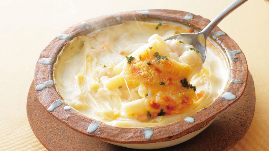 洋食の定番、マカロニグラタン。マカロニをアツアツのホワイトソースにからめて食べる、幸せを感じる一品です。