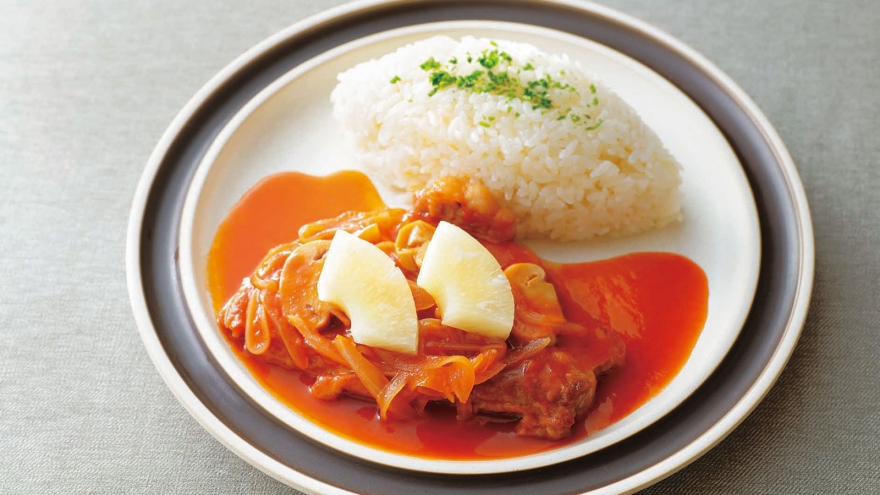 少し厚めの豚肉をケチャップソースで煮含めます。ステーキとは違う柔らかな食感がおいしい。付け合わせのバターライスと合わせて食べてください。