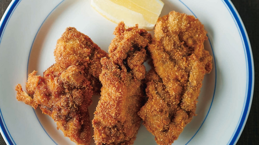サッと揚げて余熱で火を通し、“サックリ、フワッ”の食感に。油はねしやすいので、レバーの両面に切り目を入れておくのが安全のコツです。