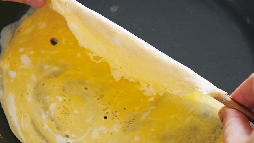 表面が乾いてきたらフライパンの上に菜箸を渡し、手で薄焼き卵を菜箸にひっかけるようにして裏返す(やけどに注意)。10秒間ほど焼いたら火から下ろす。同様にもう1枚焼く。