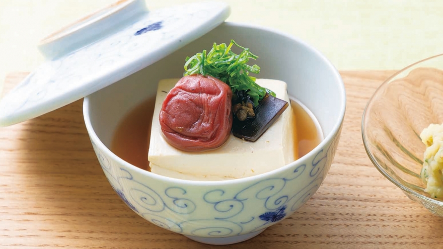 つくだ煮がベースの煮汁で温めた、おつな湯豆腐。梅干しがアクセントに。