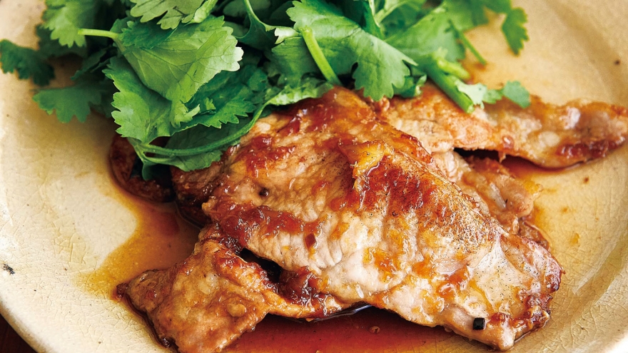 フライパンにごま油を中火で熱し、豚肉の両面をこんがりと焼く。【A】を回し入れて全体にからめ、ひと煮立ちさせる。器に盛り、パクチーを添える。