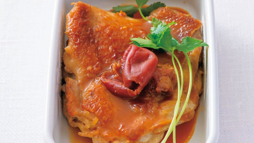 鶏肉を色よく焼いたあと、梅干し入りの煮汁で煮ます。白いご飯によく合う主菜の常備菜です。