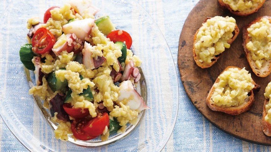 なすのディップは、サラダとあえたり、パンにのせたり色々と楽しめます。たこのかわりに、えびやいか、鶏肉でも。冷蔵庫で3~4日間保存もできて便利です。