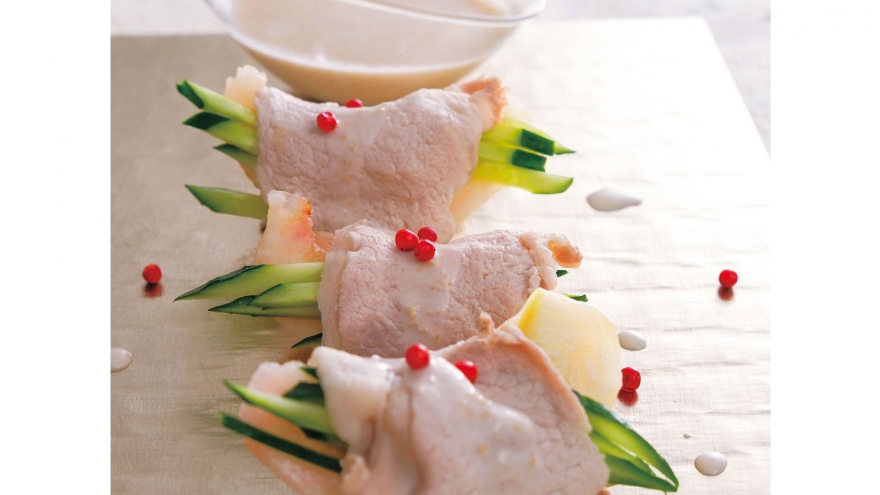 1の豚肉1枚で2のきゅうり1/6量、桃1切れを巻き、器に盛る。残りも同様につくる。【たれ】をかけ、ピンクペッパーを散らす。
