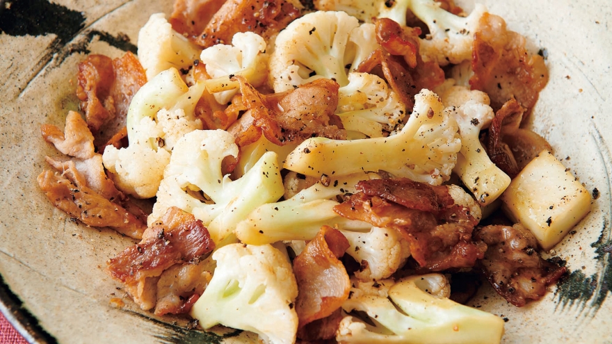 甘酢だけで味が決まるシンプル炒め。黒こしょうをたっぷりきかせると、おいしい!カリフラワーは半生に炒め、コリコリした食感を楽しみます。