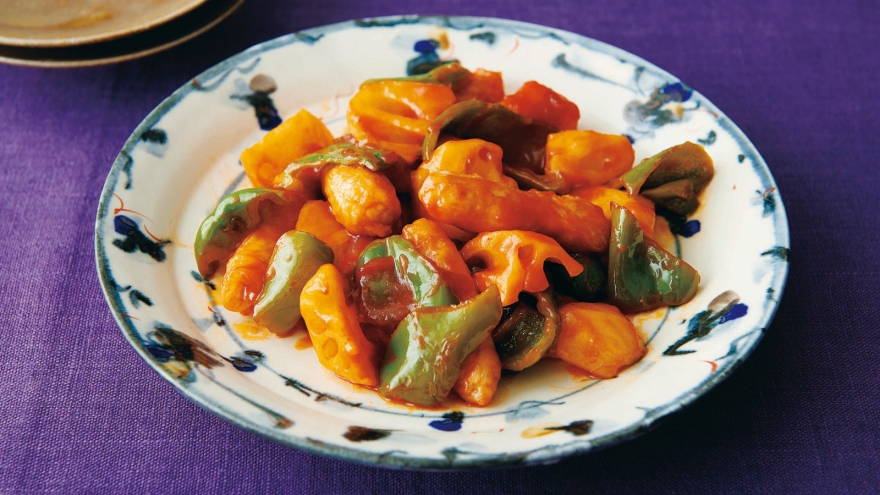 フライパンにサラダ油を中火で熱して2の豚肉を入れ、転がしながら、全体にきれいな焼き色をつける。ピーマンとれんこんを加え、2分間ほど炒め合わせる。【A】を加えて強火にし、からめながら1分間ほど炒め煮にする。