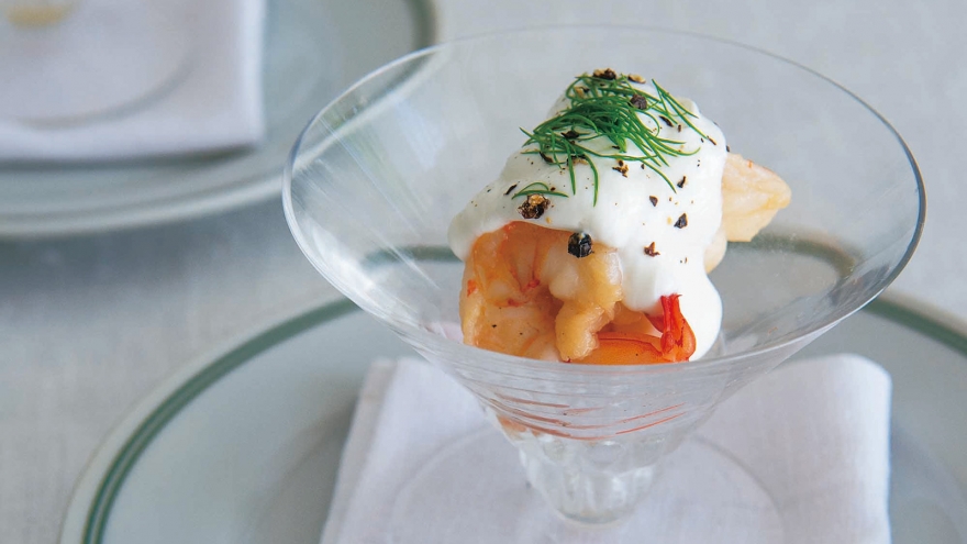 マリネしたえびを水きりヨーグルトと合わせ、爽やかな前菜に。