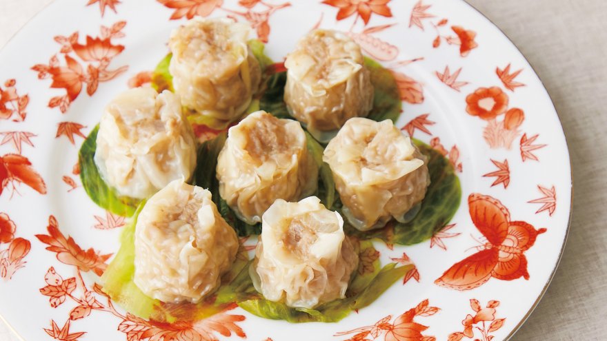 2を12等分してシューマイの皮で包む。蒸気が上がった蒸し器にレタス1枚につきシューマイ1コをのせ、強火で約12分間蒸す。