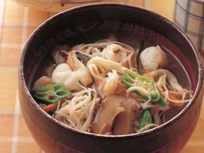 4に薄口しょうゆ・酒各小さじ2を加え、にんじんを加えて煮立てる。ここにそうめんを半分に折って加え、再び煮立ったらオクラ、えびも加えて軽く煮る。味をみてたりないようなら、薄口しょうゆ少々で調える。好みでレモン汁または酢をたらしてもよい。