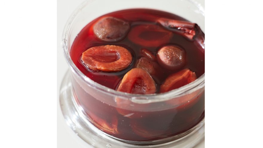 鍋に【A】を入れて中火にかけ、沸騰したら弱火にし、プルーンを加える。オーブン用の紙で落としぶたをして2〜3分間、混ぜずに煮る。火を止めて、そのまま冷ます。煮汁ごと清潔な保存容器に入れて冷蔵庫で2時間冷やす。