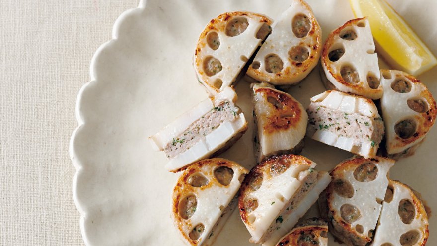 れんこんは約5mm厚さの輪切りにし、12枚用意する。