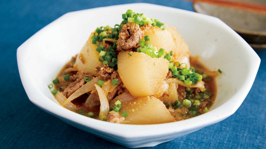 牛肉と大根を炒めてから、水を加えてコトコト。大根が透き通ってきたところで、調味料を加えてコトコト。牛肉のだしと大根のみずみずしさが味わえます。