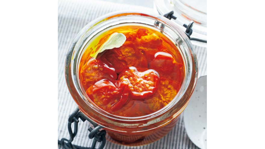 2の粗熱が取れたら、清潔な保存容器に入れる。ミニトマトがかぶるくらいまで、オリーブ油とサラダ油を同量ずつ注ぎ、ローリエを加える。すぐに食べられる。
