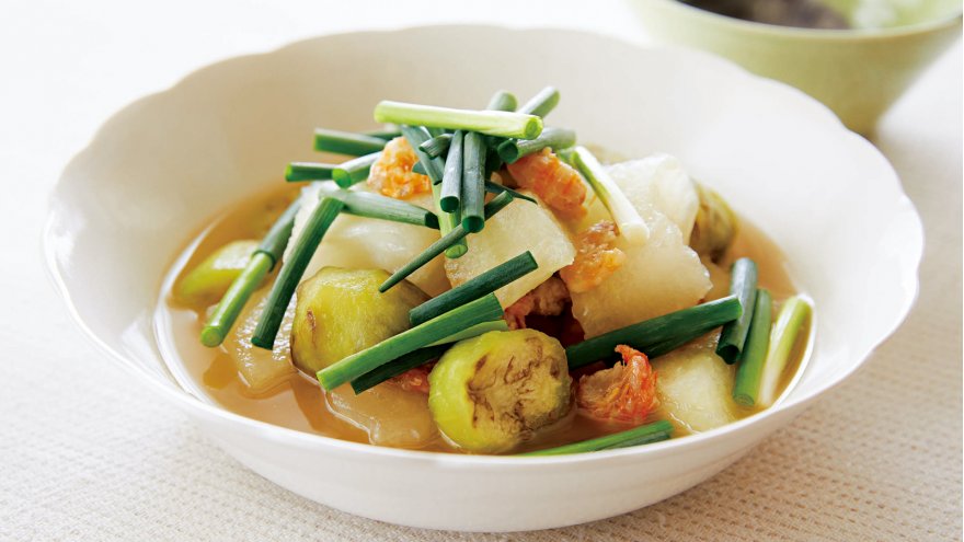 干しえびのうまみたっぷりのスープを含んだなすととうがんは、えも言われぬやさしい味わい。夏の渇きをうるおしてくれます。