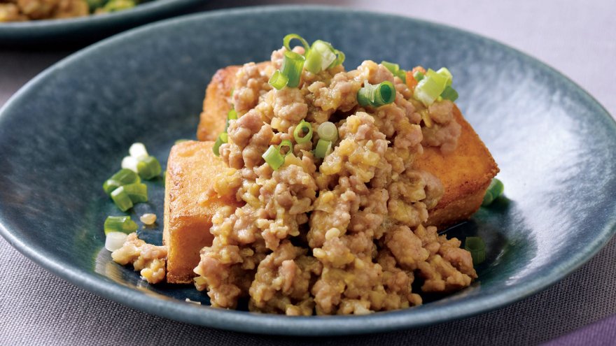 こんがり焼いた厚揚げに風味豊かな豚みそをかけた手軽な一品。豚みそはご飯や麺にのせたり、サラダにトッピングしても。
