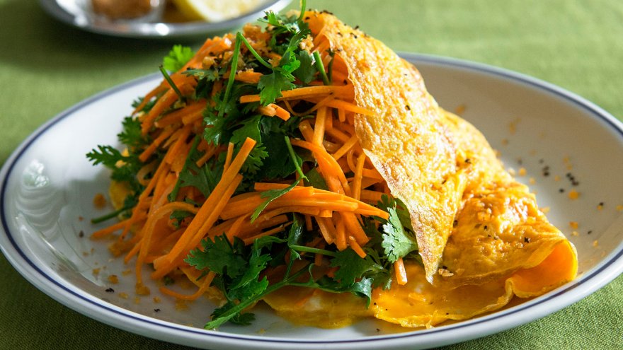 にんじんサラダとトロトロのオムレツを一緒に楽しむ一皿。オムレツがアツアツのうちに急いでサラダをはさんで!パクチーのかわりにみつばやセロリの葉でも。
