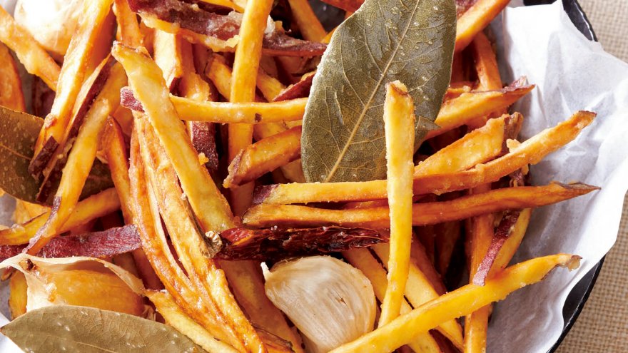フライパンに揚げ油を1.5cm深さまで注ぎ、さつまいもを広げて入れ、にんにく、赤とうがらし、ローリエを加える。中火にかけて触らずに揚げる。さつまいもが薄く色づいたら火を少し強め、さつまいもを菜箸でさばきながら1分間ほど揚げる。紙タオルにとって油をきり、塩をふる。