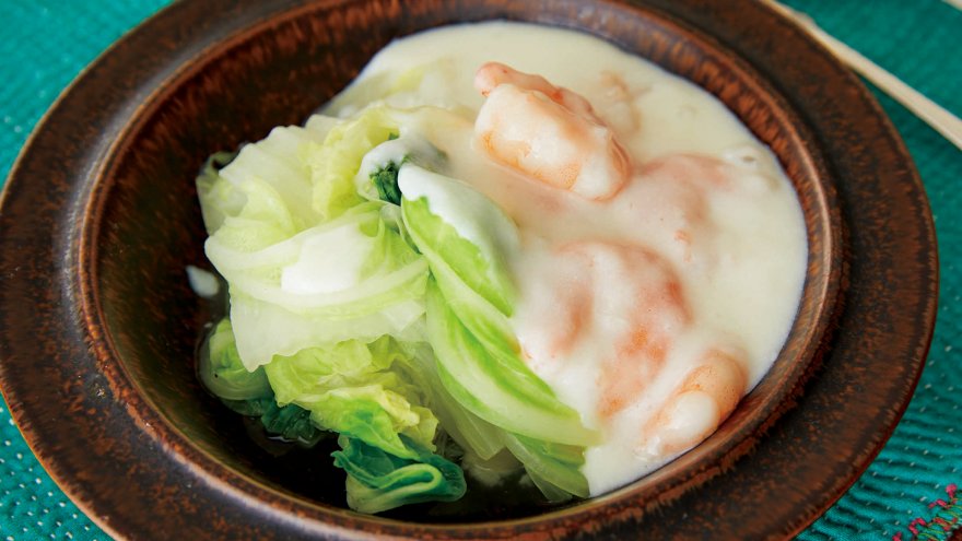 シャキッとした白菜にトロリとしたクリームがからみます。白菜とえびを別々に煮ると、それぞれのおいしさが引き立ちます。