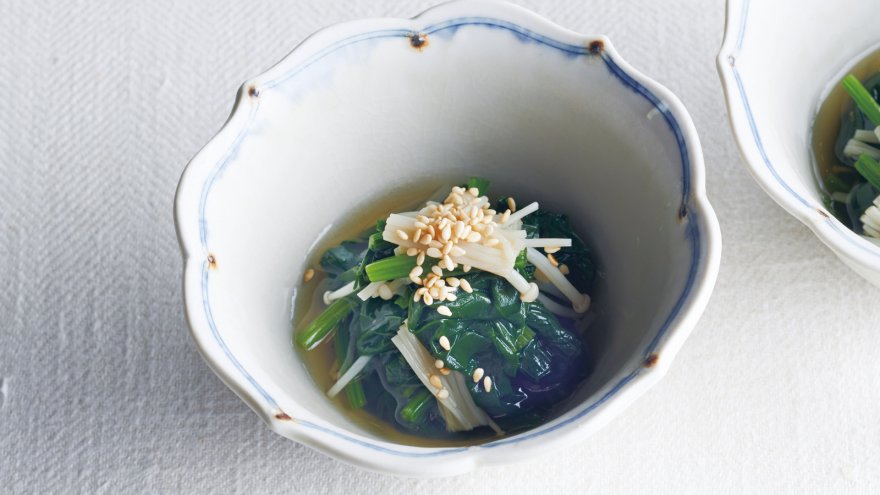 しっかりしたうまみがある「いりこだし」は、おひたしにも応用できます。えのきだけとほうれんそうの歯触りのよさを楽しんで。