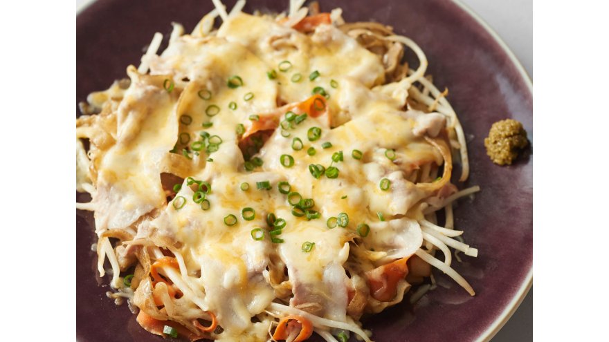 豚肉は長さを半分に切る。ボウルに【A】を入れて混ぜ合わせ、耐熱皿(直径25cm程度)に平らに広げ、豚肉を広げてのせる。ピザ用チーズをかけ、ふんわりとラップをして電子レンジ(600W)に4分間かける。ラップを外し、細ねぎを散らす。好みで柚子こしょうを添える。