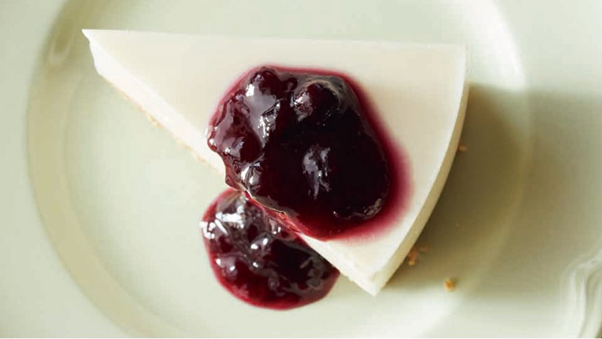 「レアチーズケーキ」をソースでアレンジ。ブルーベリーのソースは定番の相棒です。