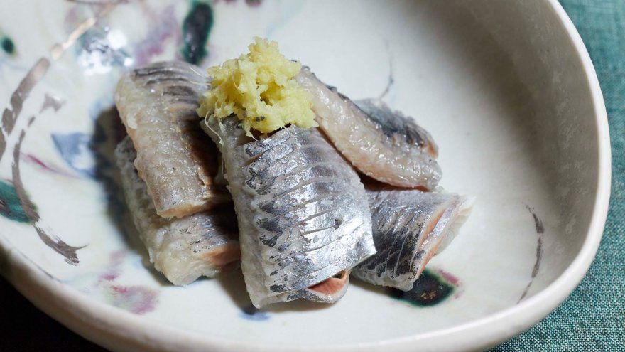 いわしの頭側から皮をはがし、尾を切り落とす。2~3mm間隔で切り目を入れ、好みの大きさに切る。器に盛り、しょうがをのせる。
