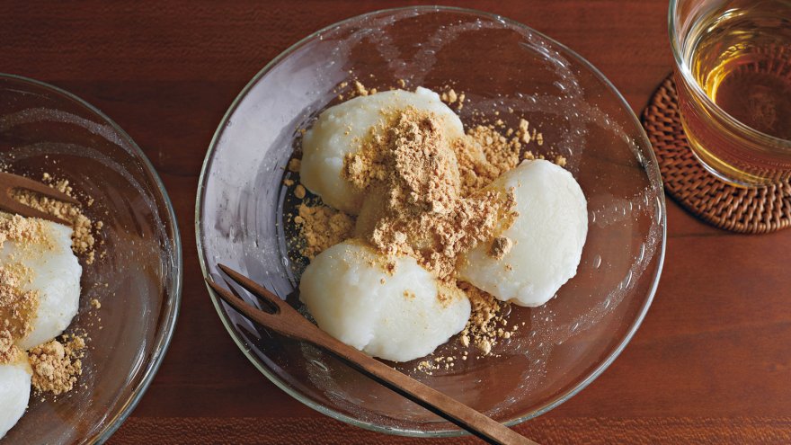 再びレンジに約3分間かけ、泡立て器でなめらかになるまで底からよく混ぜる。氷水を入れたボウルに塊のまま入れ、氷水の中で一口大にちぎってそのまま冷やす。水けをきって器に盛り、きな粉をかける。