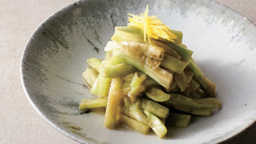 なすはヘタを除き、ピーラーで皮を薄くむく。長さを半分に切り、1cm角の棒状に切る。