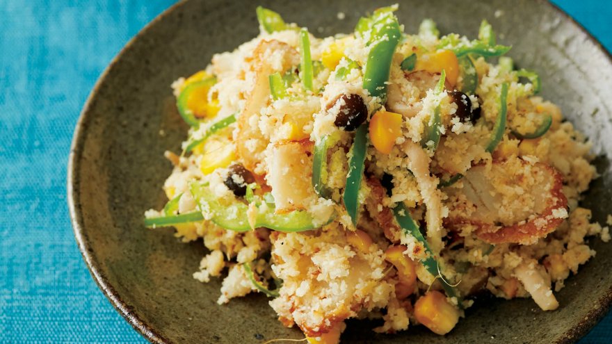 塩味のあっさりとしたおからは、ピーマンのほろ苦さ、とうもろこしの甘さがアクセント。ご飯に混ぜてもおいしいので、糖質ダウンのかさ増しにも!