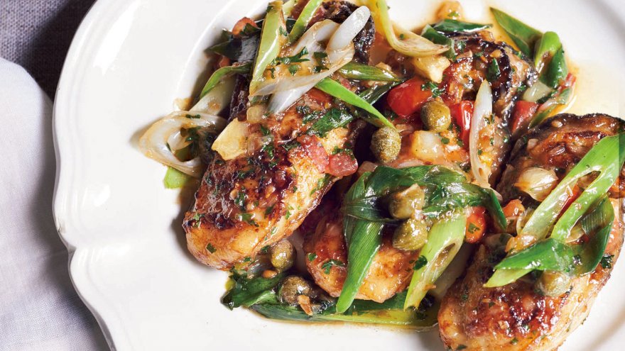 紙タオルでフライパンの余分な油を拭き取り、バターを加えて弱火にかける。バターが溶けてフツフツとしてきたら全体にからめる。ソースの材料を順に加え、強火でフライパンを揺すりながら10秒間ほど炒める。