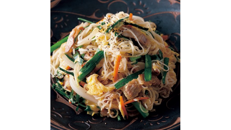 ゆでたそうめんと具材を炒め、塩、こしょうでシンプルに味つけします。豚バラ肉のうまみと野菜の風味、卵のまろやかさが、そうめんによくなじんで、お手軽なのに味わい深い一皿です。