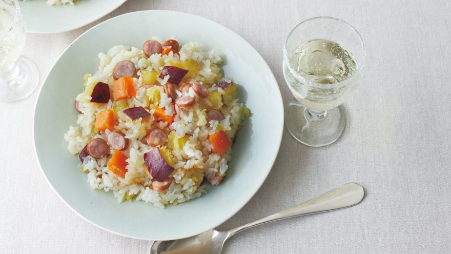 米と具材を一緒に炊き込むだけの簡単レシピ。ソーセージの塩けとうまみで味がピタリと決まります。