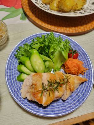 ジッパー付き保存袋に鶏肉、1、オリーブ油大さじ4+1/2、塩1つまみを入れ、しっかりと空気を抜いて袋の口を閉じ、常温で30分間つけておく。