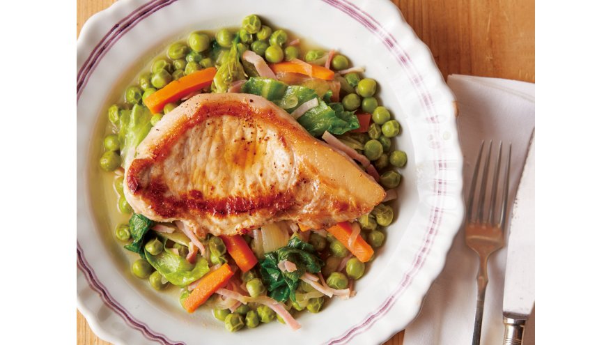 まるで水玉のようなグリンピースが主役の、軽やかなバター煮。バターの風味が野菜のおいしさをグッと底上げしてくれます。多めにつくっておくと、肉や魚の付け合わせに、汁けを増やしてスープにと、使い勝手抜群です。
