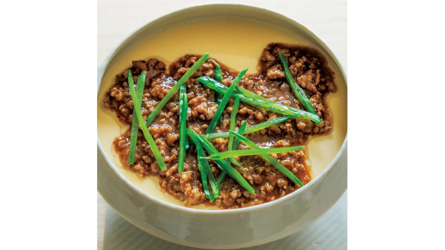 卵だけのシンプルな茶碗(わん)蒸しに、アツアツのひき肉あんをかけてごちそうに。繊細な口当たりが楽しめます。