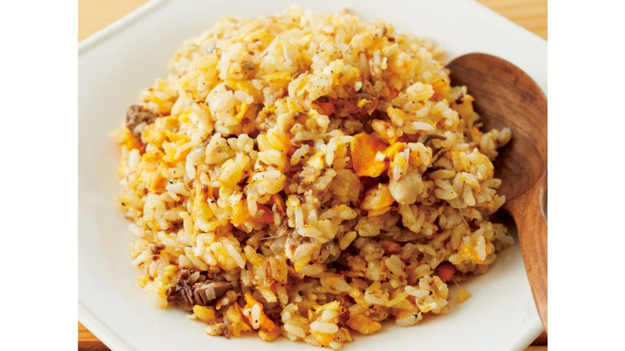 フライパンにいわしのしょうがオイル煮の漬け油を中火で熱し、溶き卵を流し入れる。半熟状になったら、ご飯を加えてほぐすように炒め合わせる。